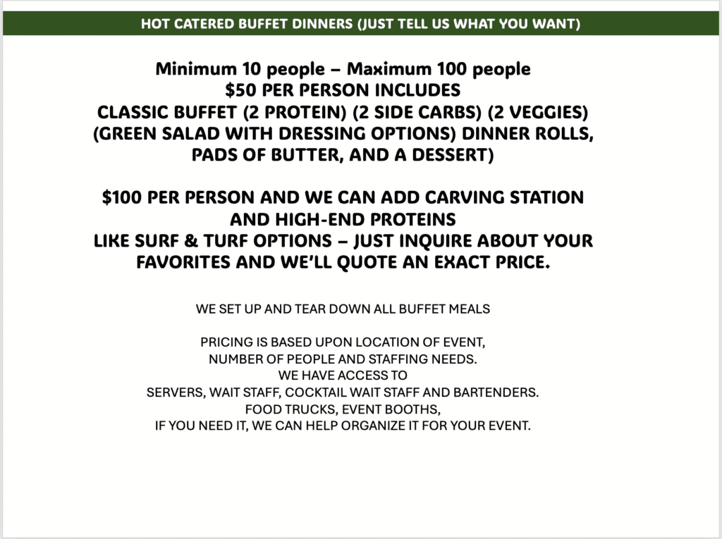 We deliver, can set up, clean up, and offer you staffing options when needed. We are here to meet your specific needs. We have several staple items, but would prefer to cater your meal exactly as you want it.