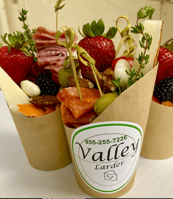 Our cups are stuffed with cube cheese (Havarti; Dill Havarti; Manchego; or Gouda); Salami; fresh seasonal fruit and veggies during winter months; nuts; and decorated with seasonal herbs and edible flowers.